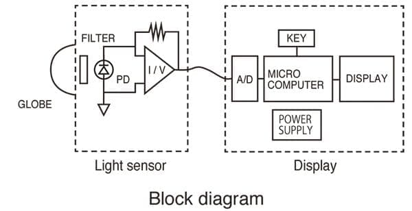 Cảm biến ánh sáng của máy đo độ sáng bao gồm một diode quang chuyển đổi ánh sáng thành tín hiệu điện, một bộ lọc quang học đảm bảo độ nhạy giống như mắt người và một quả cầu khuếch tán tạo điều kiện thuận lợi cho việc hiệu chỉnh cosin, do đó đáp ứng các yêu cầu đối với loại thiết bị này.