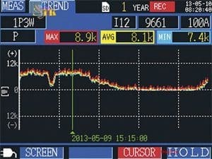 Màn hình PW3360-20 ghi lại các giá trị đo được dưới dạng đồ thị để sử dụng thuận tiện trong quản lý nguồn điện. Ngoài các giá trị đo được tức thì, bạn có thể xem lại giá trị lớn nhất, tối thiểu và trung bình bằng cách di chuyển con trỏ trên biểu đồ nhu cầu và đồ thị xu hướng hiển thị.