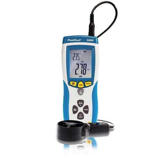 Máy đo gió cánh quạt 2 trong 1 tích hợp nhiệt kế hồng ngoại không tiếp xúc và màn hình LCD đa chức năng kỹ thuật số, có đèn nền. PeakTech P5060 được sử dụng để đo vận tốc không khí, luồng không khí và nhiệt độ bề mặt, được hiển thị lên đến 500°C (932 ° F) với độ phân giải quang học 30: 1 (khoảng cách đến điểm). Thiết bị kết hợp có thể được sử dụng trong việc lắp đặt, sửa chữa, chẩn đoán và tối ưu hóa công nghệ điều hòa không khí. PeakTech còn giúp kiểm tra, lắp đặt và kiểm tra máy hút mùi, lắp đặt, bảo trì và phân tích hệ thống thông gió. Nó cũng là lựa chọn tuyệt vời cho việc kiểm tra / phân tích gió và nhiệt độ xung quanh, phòng nồi hơi, giám sát lưu lượng ion hóa, kiểm tra khí động học của ô tô, nhà máy – và bảo trì tòa nhà.