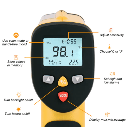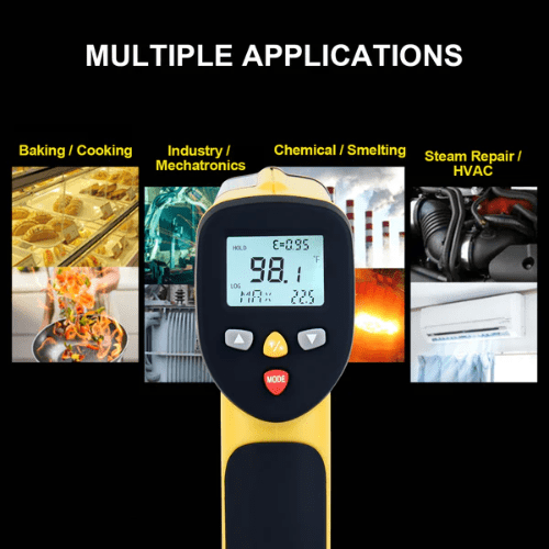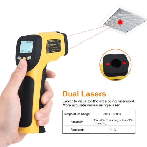 Máy đo nhiệt độ hồng ngoại bằng tia laser kép nhỏ gọn được sử dụng rộng rãi để đo nhiệt độ trong công nghiệp.